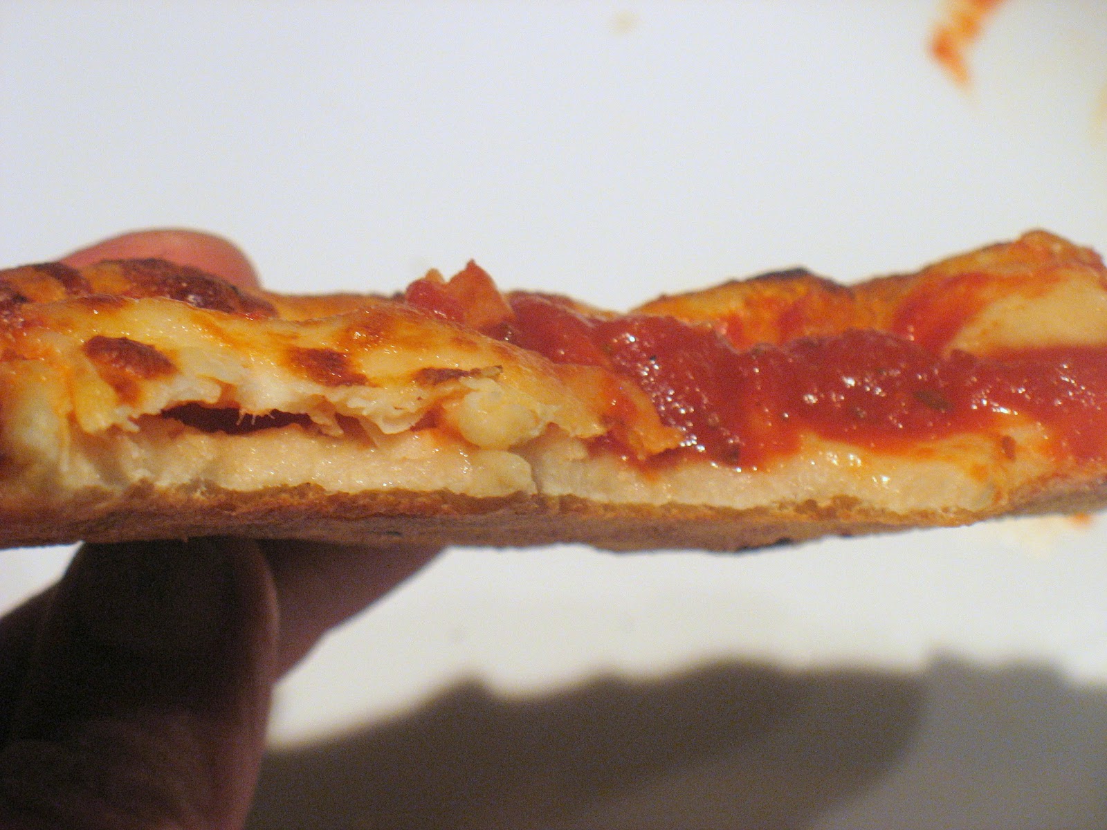 This had a dry bottom that was rather soft. The crust was thin, and a little gummy. The dough didn't seem to have risen very much, and I couldn't see any air holes in the cross-section.